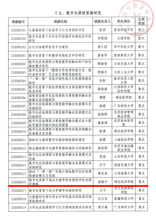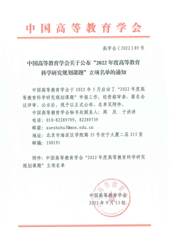 近日,中国高等教育学会公布“2022年度高等教育科学研究规划课题”立项名单,公司5个重点项目,4个一般项目获批立项。公司龚振中教授的《数字化背景下混合式教学的有效性评价及提升策略》获2022年度中国高等教育学会专项课题重点立项。