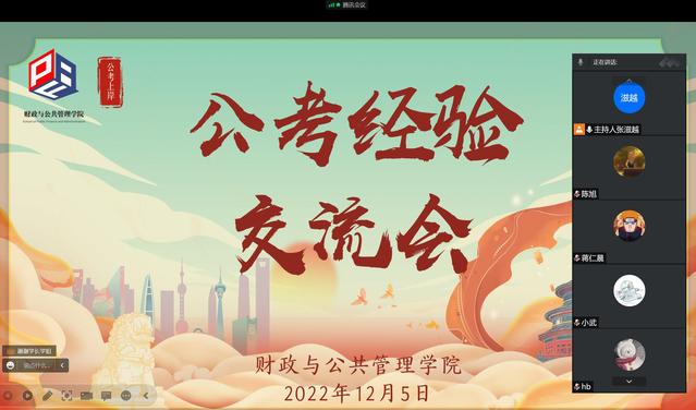 本网讯(通讯员:张滋越)为助力毕业生公考上岸,帮助在校生了解公考备考方法和策略,12月5日19:30,公司联合公司老员工就业创业指导中心,通过腾讯会议成功举办公考经验分享交流会。会议邀请优秀员工,2022届毕业生毛琦舒、蒋仁晨、郭章悦担任主讲嘉宾,2023届毕业生线上参会。会议由辅导员张滋越主持。