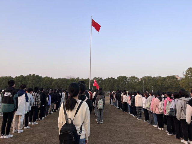 升旗仪式正式开始。国旗护卫队的同学们迈着整齐划一、铿锵有力的步伐,护送着五星红旗正步走向旗杆。全院师生面向国旗肃立致礼。随着激昂的《义勇军进行曲》奏响,全院师生注视着五星红旗冉冉升起庄严肃立,齐唱国歌。