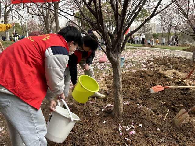 活动中,公司志愿者前往指定区域植树,拿铁锹挖坑、浇水灌溉,大家配合默契,干劲十足,将一颗颗幼苗植入土中,播下绿色希望,寄托祝福共同成长。本次活动共栽种了120棵垂丝海棠、10株美人梅,公司志愿者共栽种了两颗美人梅,经院之美更添一分。