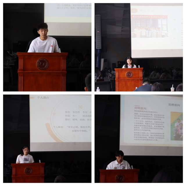 大会首先进行了换届仪式。各部门竞聘人依次上台演讲,介绍自己的个人情况,展示工作参与情况和竞聘意向。各部门负责人针对竞聘人进行提问考核。