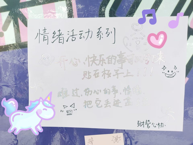 活动现场设置了两个环节,“抛弃情绪”和“美愿成真”。在“抛弃情绪”环节中,参与者可以匿名将自己想写的话写在便利贴或小纸条上,包括开心、难过、悲伤等情绪,抛弃完不喜欢的坏情绪后拿走几颗糖果作为奖励,也可以选择留下QQ号联系方式,心理协会志愿者定期回复,提供一些情绪上的帮助和支持;在“美愿成真”环节中,参与者可以在便利贴上写下自己对他人的祝福话语,并将其贴在展板上,分享美好和支持,传递关爱和温暖。