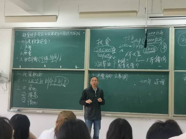本次实践教学围绕着粮食安全的定义、粮食生产的政策设计,以及粮食的保供要素三个方面展开。刘应文提出粮食安全不仅关乎数量安全,也包含质量安全、以及持续供给安全,并以“烟草业”和“毒品”为例,阐述政策背后的逻辑,即进行背景分析,评估约束条件,合理确定指标,才能权衡利弊,通过对比进行取舍。以此引出城乡二元社会背景下的“粮食安全”,不能过多的消耗农业,而是通过发展产业促进农业现代化建设,农村应该成为“社会的稳定器”,基于此,设计出“4M1E”模型,即根据不同的农户规模制定不同的战略:小规模农户进行品控、标识;大规模农户进行统筹,提高精作效能。课堂上,李春、林鑫泉、龙宇等同学展开热烈讨论和提问,讲座时间一再延长。
