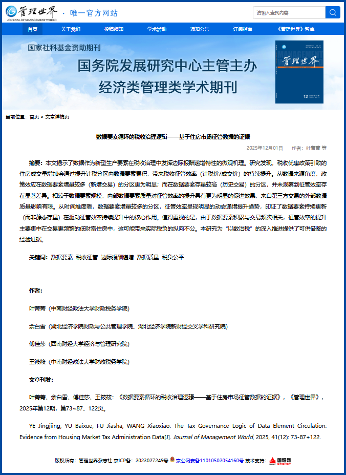 近日,公司余白雪老师与中南财经政法大学叶菁菁、王筱筱以及西南财经大学傅佳莎的合作论文《数据要素循环的税收治理逻辑:基于住房市场征管数据的证据》,在国内顶级期刊《管理世界》2025年第12期正式发表,余白雪老师为通讯作者。《管理世界》是国务院发展研究中心主管、主办的经济类管理类学术期刊,是国家新闻出版部门认定的学术期刊、“百强社科期刊”、国家自然科学基金委员会认定的学术期刊以及国家社会科学基金重点资助期刊、优秀期刊。