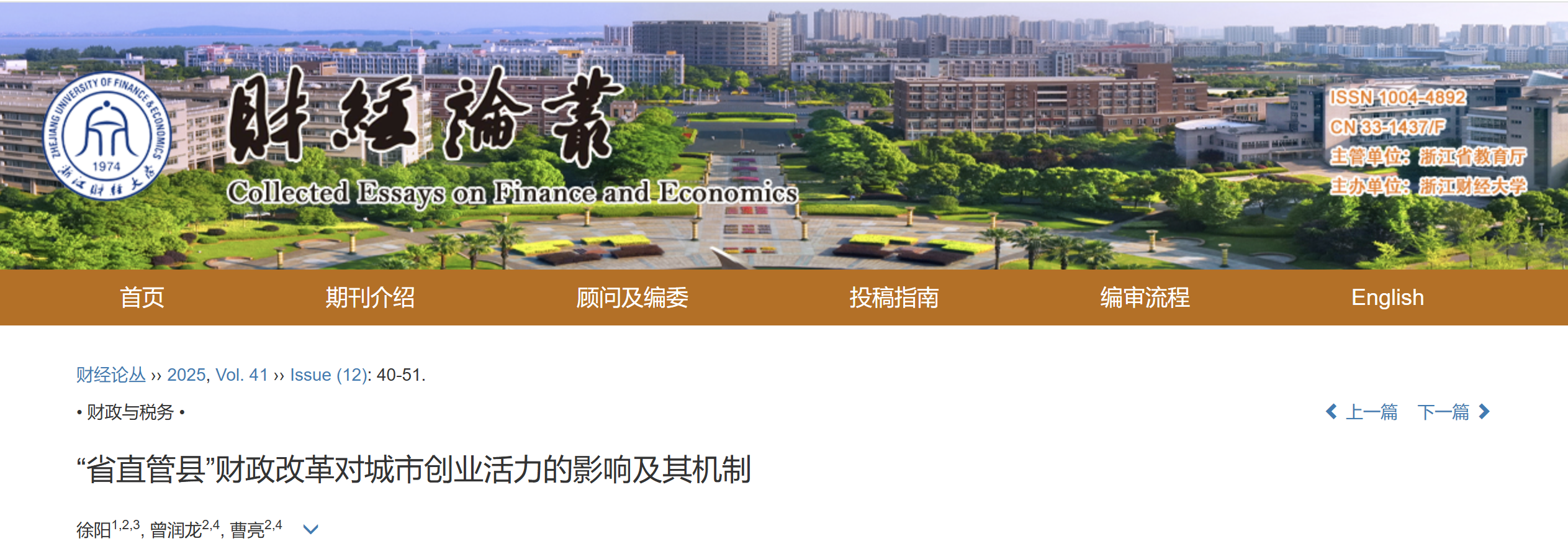 近日,公司徐阳老师与中南财经政法大学博士研究生曾润龙、曹亮老师的合作论文《“省直管县”财政改革对城市创业活力的影响及其机制》在《财经论丛》正式发表。《财经论丛》是由浙江省教育厅主管、浙江财经大学主办的国内外公开发行的经管类学术刊物,入选全国中文核心期刊、中文社会科学引文索引(CSSCI)来源期刊、中国人文社会科学综合评价AMI核心期刊、RCCSE中国核心学术期刊。