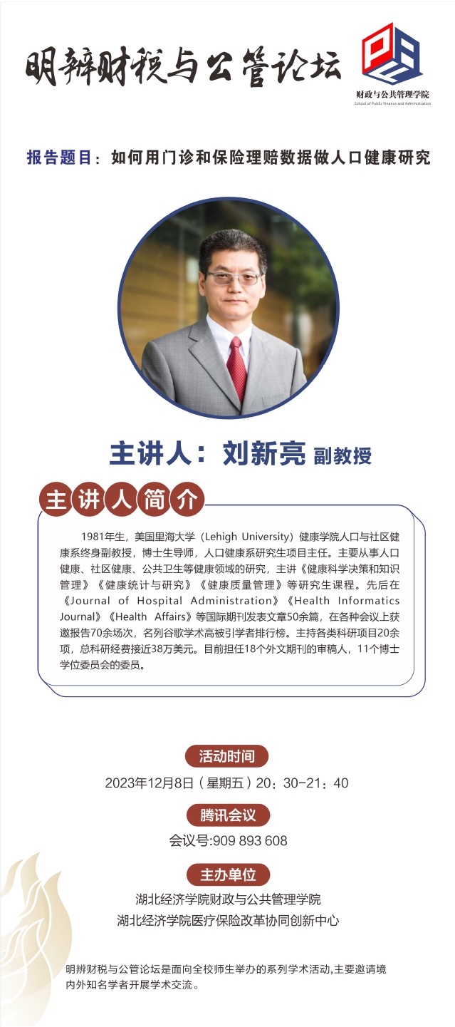 12月8日晚上8:30,美国里海大学(Lehigh University)健康公司刘新亮副教授在线上为公司师生做题为“如何用门诊和保险理赔数据做人口健康研究”的讲座,来自公司、中南财经政法大学、华中师范大学的师生共50余人参加了论坛。论坛由医疗保险改革协同创新中心袁妙彧主任主持。